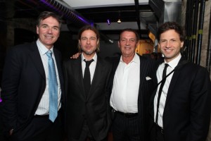 L-R, Billy Beane, Brad Pitt, unidentified, and Director Bennett Miller at the Vitaminwater rooftop celebrating Moneyball at the 2011 Toronto International Film Festival.